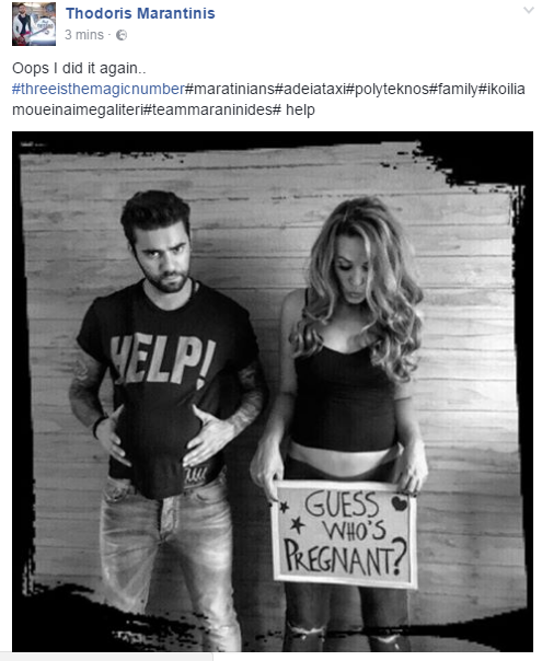 Ο Θοδωρής Μαραντίνης το βράδυ της Τρίτης, 11 Οκτωβρίου πόσταρε μία φωτογραφία στα social media όπου ποζάρει με την εγκυμονούσα σύζυγό του, η οποία κρατάει μία πινακίδα που αναγράφει: “Μαντέψτε ποια είναι έγκυος”!