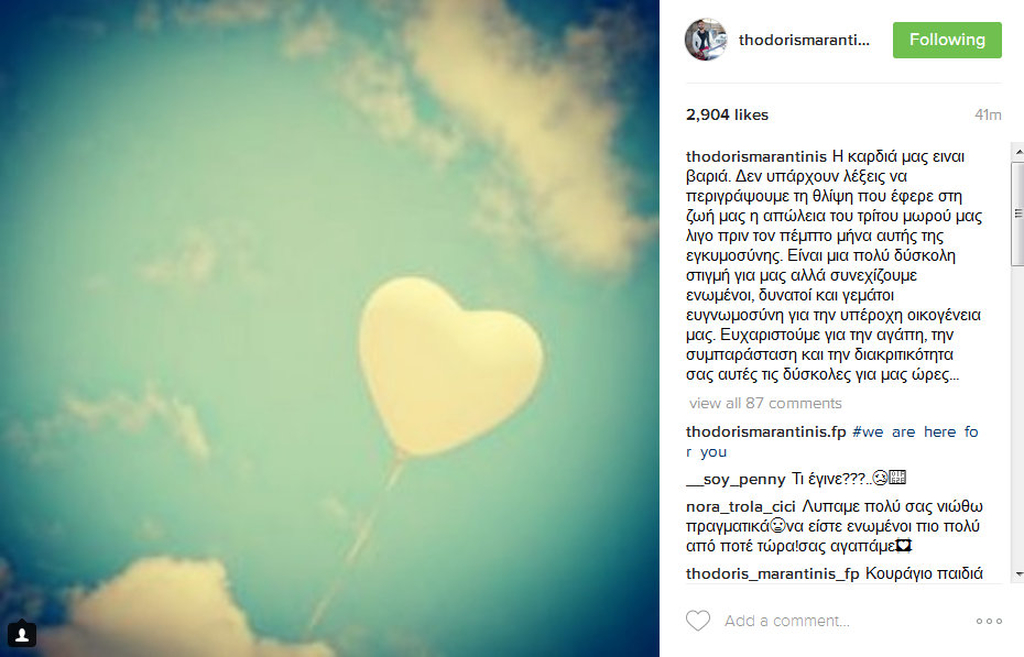 "Η καρδιά μας είναι βαριά. Δεν υπάρχουν λέξεις να περιγράψουμε τη θλίψη που έφερε στη ζωή μας η απώλεια του τρίτου μωρού μας λίγο πριν τον πέμπτο μήνα αυτής της εγκυμοσύνης. Είναι μια πολύ δύσκολη στιγμή για μας αλλά συνεχίζουμε ενωμένοι, δυνατοί και γεμάτοι ευγνωμοσύνη για την υπέροχη οικογένεια μας. Ευχαριστούμε για την αγάπη, την συμπαράσταση και την διακριτικότητα σας αυτές τις δύσκολες για μας ώρες…" έγραψε στο instagram ο Θοδωρής Μαραντίνης.