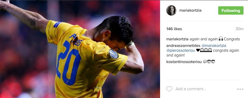 Η Μαρία Κορτζιά δεν θα μπορούσε να ήταν πιο περήφανη για τον σύντροφό της Πιέρο Σωτηρίου, ο οποίος ήταν ο σκόρερ του γκολ στο χθεσινό παιχνίδι και μάλιστα πόσταρε μία φωτογραφία στον προσωπικό της λογαριασμό στο instagram με τον ποδοσφαιριστή να κάνει την αγαπημένη του κίνηση dab και στη λεζάντα που συνόδευσε την εικόνα έγραψε: “Ξανά και ξανά. Συγχαρητήρια”.