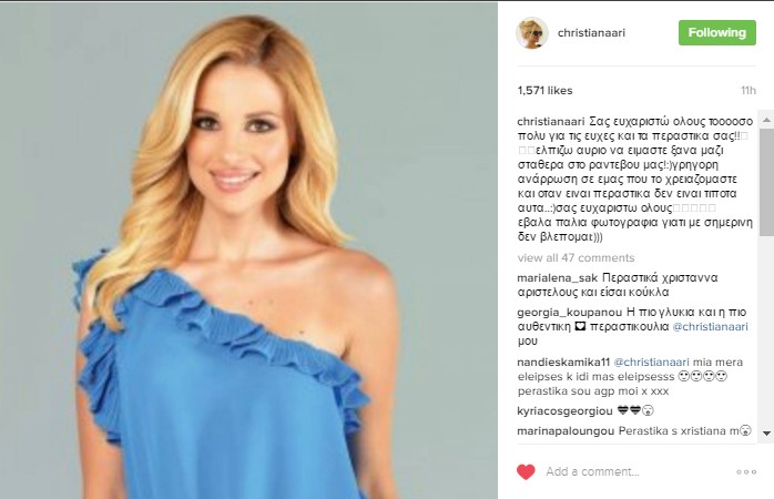Μία περιπέτεια με την υγεία της περνάει αυτές τις μέρες η παρουσιάστρια Χριστιάνα Αριστοτέλους καθώς την Κυριακή το βράδυ η ίδια εισήχθη σε ιδιωτική κλινική με συμπτώματα γαστρεντερίτιδας. Η ίδια μέσα από τον προσωπικό της λογαριασμό στο instagram θέλησε να ευχαριστήσει όσους της έστελναν τις ευχές τους για γρήγορη ανάρρωση ανεβάζοντας μία παλιά φωτογραφία της γράφοντας χαρακτηριστικά ότι η σημερινή της εικόνα δεν βλέπεται. Ακόμη και στις δύσκολες στιγμές το χιούμορ δεν εγκαταλείπει την παρουσιάστρια. Τα περαστικά μας να της ευχηθούμε και πάλι.