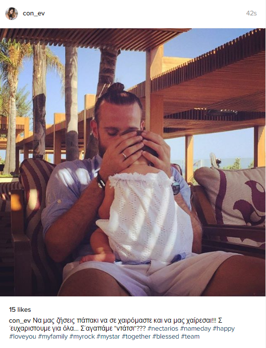 Η παρουσιάστρια, πόσταρε μία εικόνα όπου απεικονίζεται ο ποδοσφαιριστής αγκαλιά με την κορούλα τους, Αριάδνη, ενώ στη λεζάντα που τη συνόδευσε έγραψε: “Να μας ζήσεις πάπακι να σε χαιρόμαστε και να μας χαίρεσαι!!! Σ´ ευχαριστούμε για όλα... Σ´ αγαπάμε "ντάτσι"???”