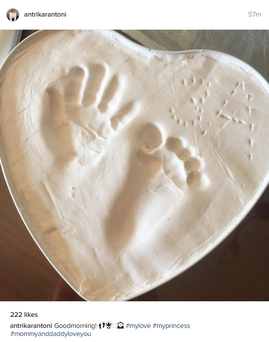 Η ραδιοφωνική παραγωγός του Super FM, χρησιμοποίησε ειδικό υλικό σε σχήμα καρδιάς, όπου εκεί σχημάτισε το σχήμα της παλάμης και της πατούσας της μπέμπας της, προκειμένου να το έχει για πάντα θυμίζοντάς της αυτή την περίοδο, όταν η κόρη της θα έχει μεγαλώσει. Δείτε πιο κάτω την εικόνα που ανήρτησε: