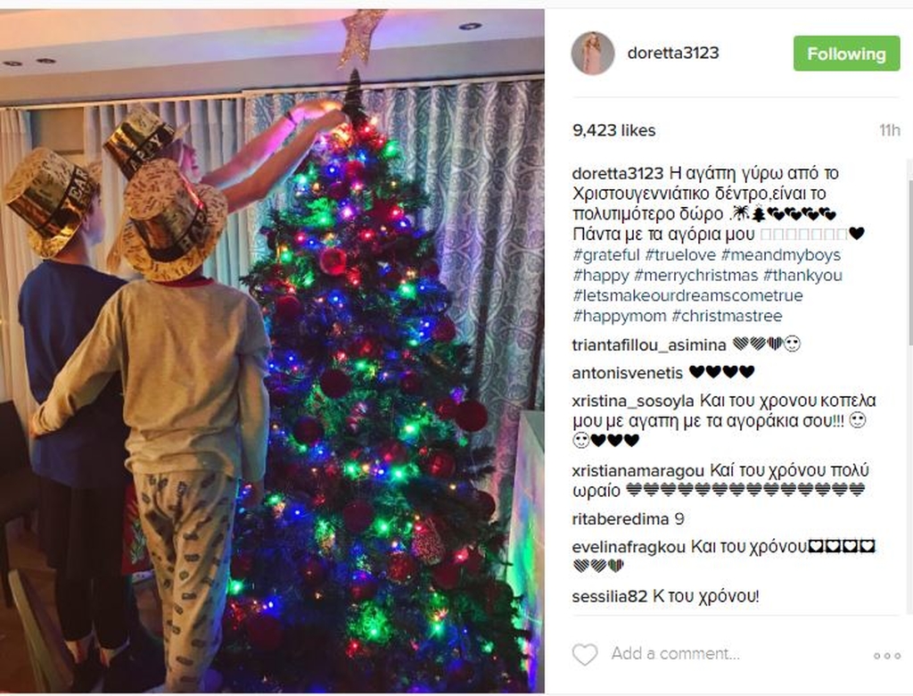 Τα Χριστούγεννα είναι οικογενειακές γιορτές και αυτό κάνει και η Ντορέττα Παπαδημητρίου καθώς φρόντισε να στολίσει το χριστουγεννιάτικο δέντρο του σπιτιού παρέα με τους δύο της γιους. "Η αγάπη γύρω από το Χριστουγεννιάτικο δέντρο, είναι το πολυτιμότερο δώρο. Πάντα με τα αγόρια μου" έγραψε στη λεζάντα που συνόδευε τη φωτογραφία. Όπως μπορείτε και εσείς να δείτε τα χρώματα που κινήθηκε ο διάκοσμος ήταν κυριώς το κόκκινο με λαμπιόνια σε μπλε και πράσινο χρώμα.