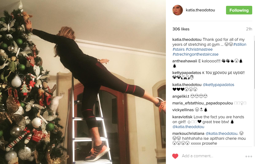 Η Κύπρια socialite μάλιστα ανήρτησε μία φωτογραφία στον προσωπικό της λογαριασμό στο instagram, τοποθετώντας ένα στολίδι στην κορυφή του δέντρου, χρησιμοποιώντας σκάλα, ενώ με διάθεση αυτοσαρκασμού έγραψε στη λεζάντα που τη συνόδευσε: “Ευχαριστώ για όλα αυτά τα χρόνια που έκανα stretching στο γυμναστήριο”. Δείτε πιο κάτω τη φωτογραφία: