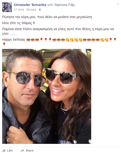 Πολύ συγκινητικά και όμορφα ήταν και τα λόγια που της αφιέρωσε μέσα από το facebook και ο σύζυγός της, Χριστόφορος Τορναρίτης, προκειμένου να της ευχηθεί. Ο επιχειρηματίας, έγραψε συνοδεύοντας μία φωτογραφία τους: “Ρώτησα την κόρη μου ποιου θέλει να μοιάσει σαν μεγαλώσει. Μου είπε της μάμας. Ραμόνα είσαι πλέον αναγκασμένη να γίνεις αυτό που θέλεις η κόρη μου να γίνει. Χρόνια Πολλά”.