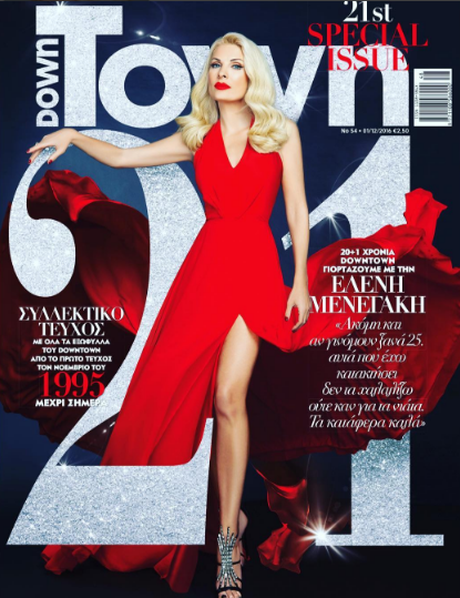 Η Ελένη Μενεγάκη φωτογραφήθηκε για τις ανάγκες του επετειακού τεύχους του ελληνικού περιοδικού Down Town με αφορμή τη συμπλήρωση 21 χρόνων κυκλοφορίας του.