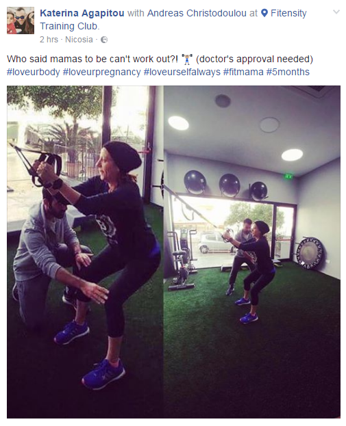 Στη λεζάντα που συνόδευσε την εικόνα έγραψε: “Ποιος είναι ότι οι μέλλουσες μανούλες δεν μπορούν να γυμνάζονται; (χρειάζεται η έγκριση του γιατρού)”.