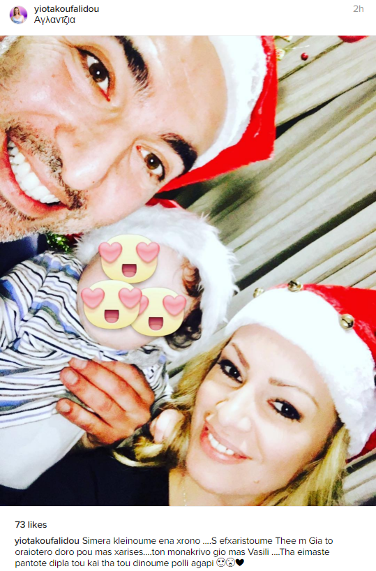 Η παρουσιάστρια, ανήρτησε στα social media μία οικογενειακή τους φωτογραφία, γράφοντας στη λεζάντα που τη συνόδευσε: “Σήμερα κλείνουμε ένα χρόνο… Σε ευχαριστούμε Θεέ μου για το ωραιότερο δώρο που μας χάρισες… τον μονάκριβο γιο μας Βασίλη… Θα είμαστε πάντοτε δίπλα του και θα του δίνουμε πολλή αγάπη”.