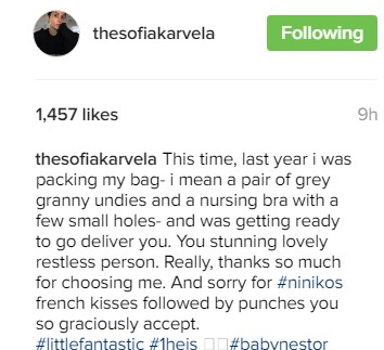 “Πέρσι τέτοια ώρα ετοίμαζα τη βαλίτσα μου -τα γκρι εσώρουχα της “γιαγιάς” και ένα σουτιέν θηλασμού με λίγες μικρές τρύπες – και ήμουν έτοιμη για τον τοκετό. Είσαι ένα εκπληκτικό, ακούραστο και αγαπησιάρικο πλάσμα. Αλήθεια σε ευχαριστώ τόσο πολύ που με επέλεξες. Συγνώμη για τα φιλιά και τις μπουνιές του Νινίκου που τόσο ευγενικά τις δέχεσαι”, έγραψε χαρακτηριστικά στο instagram και πόσταρε την ακόλουθη φωτογραφία. Τι ευχές μας να στείλουμε και εμείς στον μικρό Νέστορα για τα πρώτα του γενέθλια.