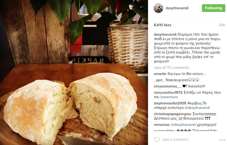 Η Δέσποινα Βανδή αρκετά συχνά ενημερώνει μέσα από τα social media τους διαδικτυακούς της φίλους για στιγμές από τη καθημερινότητα της αλλά και εικόνες μέσα από το σπίτι της. Αυτή τη φορά θέλησε να θυμηθεί τα παιδικά της χρόνια και την αγαπημένη της συνήθεια. Η Δέσποινα Βανδή έψησε το ψωμί της και νοστάλγησε την εποχή που κάθε πρωί την έστελνε η μητέρα της στον φούρνου.