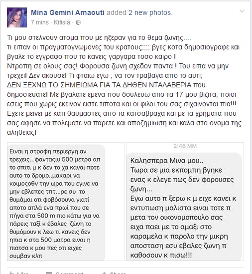 Σήμερα η Μίνα ξεσπά ξανά μετά από όσα ειπώθηκαν και γράφτηκαν ότι η κανείς από τους επιβαίνοντες στο μοιραίο τζιπ, δε φορούσε ζώνη. Η Μίνα με νέα ανάρτηση που συνοδεύεται από μηνύματα φίλων της σχετικά με τη συνήθειά της να φοράει ζωνη ασφαλείας, έκανε λόγο για τη χρήση ζώνης αλλά ανέφερε ότι είπε στον Παντελή Παντελίδη να μην τρέχει και εκείνος δεν την άκουσε... "Τι φταίω εγώ; Να τον τράβαγα από το αυτί" έγραψε χαρακτηριστικά.