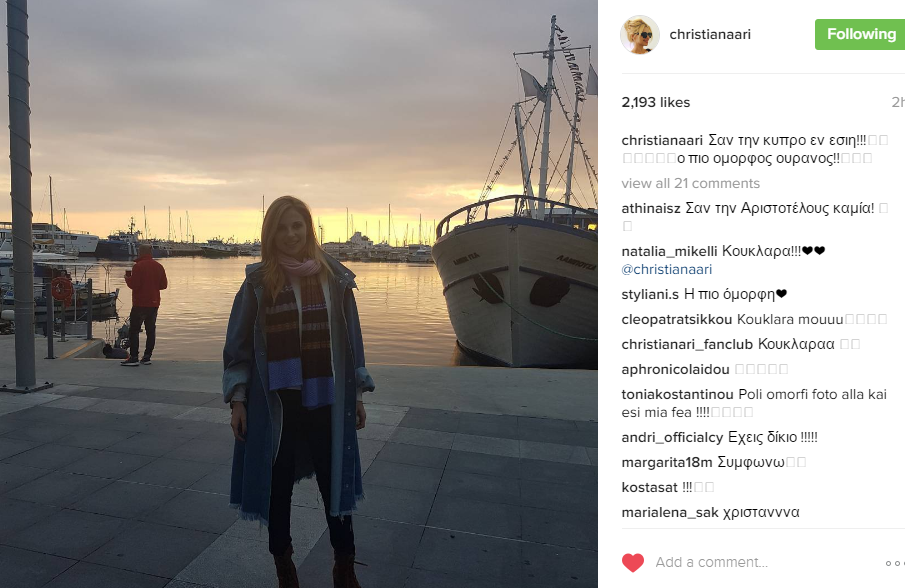 Μάλιστα, η ίδια δεν έκρυψε την αγάπη που έχει για το νησί μας και τις ομορφιές του, επισημαίνοντας στη λεζάντα που τη συνόδευσε: “ Σαν την Κύπρο εν εσιη! Ο πιο όμορφος ουρανός!”, με αρκετούς από τους διαδικτυακούς της φίλους να αφήνουν εγκωμιαστικά σχόλια για εκείνην.
