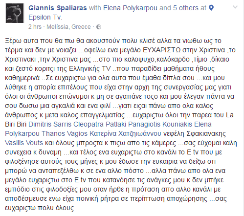 Ο Σπαλιάρας, έχει αποχωρήσει από την εκπομπή της Χριστίνα Λαμπίρη, καθώς όπως ο ίδιος επισήμανε σε ανάρτησή του στο facebook έλαβε πρόταση από άλλο κανάλι. Δείτε πιο κάτω το post του: