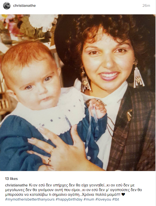 Ο λόγος για τη Χριστιάνα Θεοδώρου, η οποία ανήρτησε στον προσωπικό της λογαριασμό στο instagram, μία φωτογραφία, όπου η ίδια απεικονίζεται σε πολύ μικρή ηλικία στην αγκαλιά της μητέρας της, η οποία έχει τα γενέθλιά της.