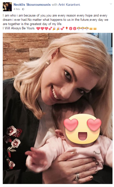 Ο Νεοκλής θέλοντας να τιμήσει τη σύζυγό του, ανήρτησε στον προσωπικό του λογαριασμό στο facebook, μία φωτογραφία, όπου απεικονίζεται η ίδια έχοντας στην αγκαλιά της την μπέμπα τους, γράφοντας στη λεζάντα: “Είμαι αυτός που είμαι εξαιτίας σου, είσαι ο κάθε λόγος, η κάθε ελπίδα και το κάθε όνειρο που είχα ποτέ. Ανεξάρτητα τι θα συμβεί μεταξύ μας στο μέλλον, κάθε μέρα που ζούμε μαζί είναι η καλύτερη της ζωής μου. Θα είμαι για πάντα δικός σου…”
