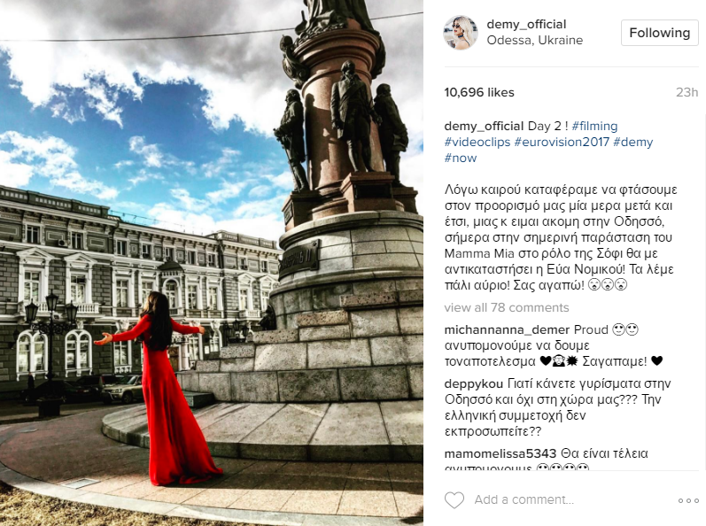 Η Demy είναι η φετινή εκπρόσωπος της Ελλάδας στη Eurovision και για τις ανάγκες του τραγουδιού της αυτές τις ημέρες βρίσκεται στην Ουκρανία για τα γυρίσματα των video clip των υποψήφιων τραγουδιών που θα παρουσιαστούν σε λίγες ημέρες.