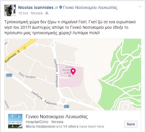 Στο Γενικό Νοσοκομείο βρέθηκε χθες ο Νικόλας Ιωαννίδης και αυτό το πληροφορηθήκαμε μέσα από ένα post του στο προσωπικό του λογαριασμό στο facebook όπου δήλωνε τη δυσαρέσκειά του για τις συνθήκες που αντιμετώπισε κατά την παραμονή του εκεί. Συγκεκριμένα ο ίδιος έγραψε "Τριτοκοσμική χώρα δεν ξέρω τι σημαίνει! Γιατί; Γιατί ζω σε ενα ευρωπαικό νησί του 2017! Δυστυχώς απόψε το Γενικό Νοσοκομείο μου έδειξε το πρόσωπο μιας τριτοκοσμικής χώρας! Λυπάμαι πολύ!". Αμέσως βέβαια οι διαδικτυακοί του φίλοι έσπευσαν να τον ρωτήσουν τι συμβαίνει με τον ίδιο να μην διευκρινίζει το λόγο που βρέθηκε εκεί.