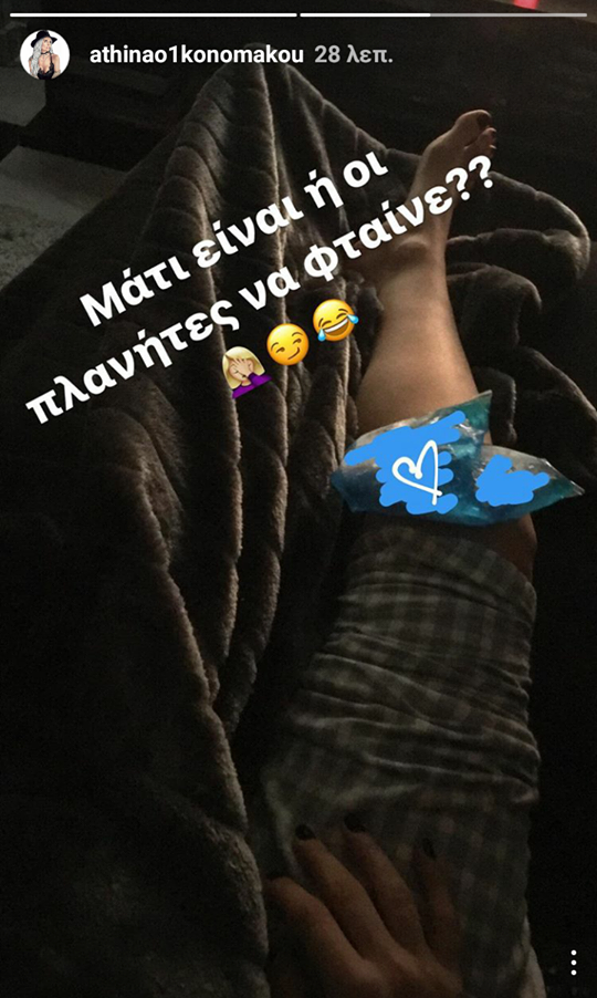 Η Αθηνά Οικονομάκου έχει πάρα πολύ καλή σχέση με τα social media και επί καθημερινής βάσεως ενημερώνει τους ακόλουθους της για το κάθε τι που κάνει και τι συμβαίνει στη ζωή της. Μάλιστα η ηθοποιός έχει ένα από τους πιο "ισχυρους" λογαριασμούς στο instagram με περισσότερους από 450 χιλιάδες followers. Έτσι η Αθηνά Οικονομάκου ενημερώνει τους διαδικτυακούςτης φίλους και για τα όμορφα αλλά και για τα δύσκολα που της συμβαίνουν. Πριν από λίγες ημέρες δημοσίευσε λοιπόν μία φωτογραφία στα instagram stories που δείχνει το πόδι της σε ακινησία και έχοντας πάγο πάνω στο γόνατό της, μετά από κάποιο μικρό ατύχημα που ενδεχομένως είχε. Η όμορφη ηθοποιός δεν αποκάλυψε τι ακριβώς της συνέβη, αφού αρκέστηκε στο να αφήσει να αφήσει τη φωτογραφία να μιλήσει από μόνη της. Συγκεκριμένα έγραψε "Μάτι είναι ή οι πλανήτες να φταίνε;" .