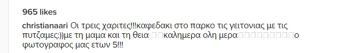 Η παρουσιάστρια ανήρτησε την φωτογραφία στο Instagram γράφοντας το εξής: "Οι τρεις χάριτες!!! Καφεδάκι στο πάρκο τις γειτονιάς με τις πιτζάμες. Με τη μαμά και τη θεία. Καλημέρα όλη μέρα. O φωτογράφος μας ετών 5!!!"