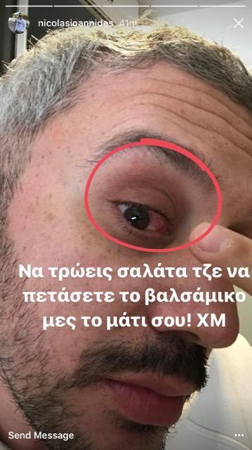Φαίνεται πως ο ίδιος έτρωγε σαλάτα και πετάχτηκε το βαλσάμικο στο μάτι του, το οποίο κοκκίνισε στο εσωτερικό του.
