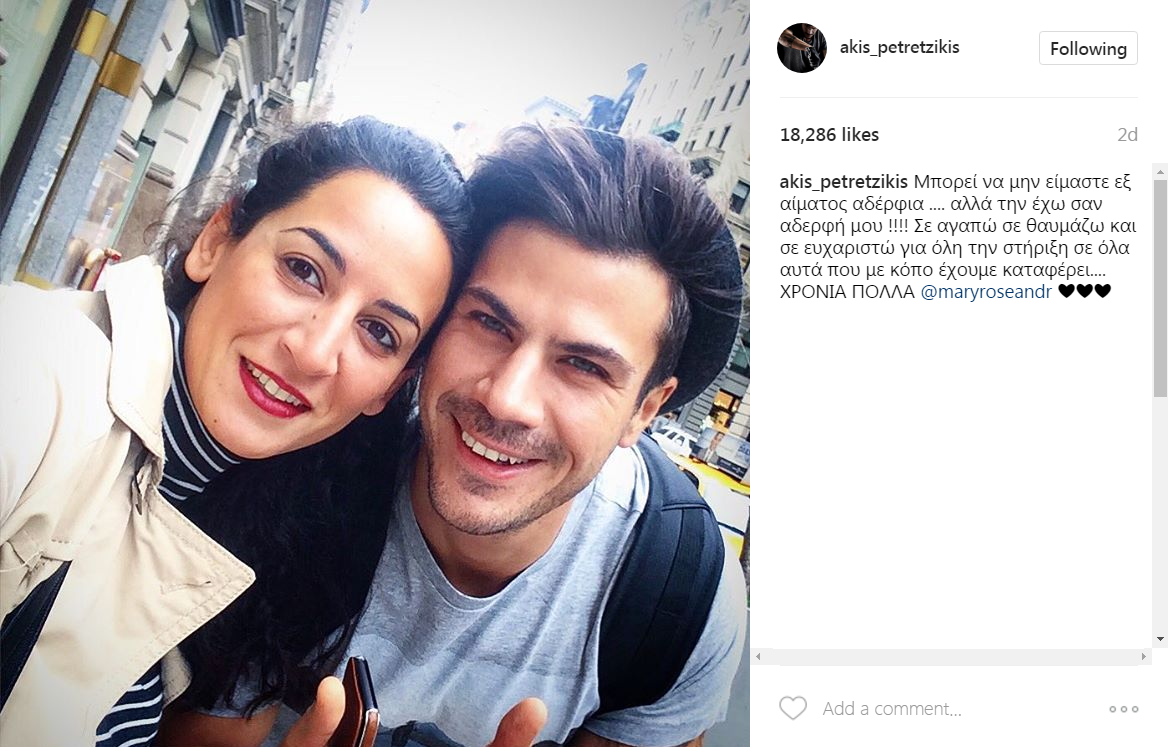 Μάλιστα, στη λεζάντα που την συνόδευε ο ίδιος έγραψε χαρακτηριστικά: "Μπορεί να μην είμαστε εξ αίματος αδέρφια .... αλλά την έχω σαν αδερφή μου !!!! Σε αγαπώ σε θαυμάζω και σε ευχαριστώ για όλη την στήριξη σε όλα αυτά που με κόπο έχουμε καταφέρει.... ΧΡΟΝΙΑ ΠΟΛΛΑ".