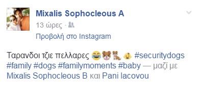 Ο ίδιος και η σύντροφός του, Παναγιώτα Ιακώβου φροντίζουν να περνούν όμορφες στιγμές με το αγοράκι τους που θα τον ονομάσουν Σοφοκλή. Μια από αυτές ήταν και η χθεσινή όπου ο ηθοποιός και παρουσιαστής πήρε τον γιο του βόλτα με το καροτσάκι και μαζί τους ήταν και οι δυο σκύλοι της οικογένειας. Xαριτολογώντας o Μιχάλης Σοφοκλέους έγραψε: "Ταρανδοι τζιε πελλαρες".