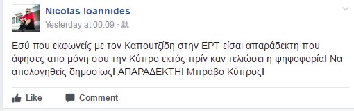 Ένα σχόλιo του Νικόλα Ιωαννίδη κατά τη διάρκεια του πρώτου ημιτελικού της "Eurovision" ήταν αρκετό για να ασχοληθούν ακόμη μία φορά με το γνωστό στυλίστα οι ελληνικές εκπομπές. Συγκεκριμένα ο ίδιος το βράδυ της Τρίτης, τη βραδιά του Α' ημιτελικού που συμμετείχε και η Κύπρος και η Ελλάδα, παρακολουθούσε το διαγωνισμό από την ελληνική τηλεόραση και ένα σχόλιο της σχολιάστριας Μαρίας Κοζάκου ήταν αρκετό για να τον εκνευρίσει και να τον κάνει να γράψει το πιο κάτω σχόλιο:
