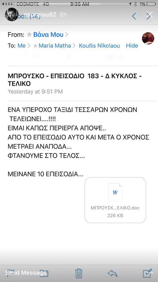 Ο λόγος για τη σεναριογράφο του “Μπρούσκο”, Βάνα Δημητρίου, η οποία παρέδωσε στον Ανδρέα Γεωργίου, μερικά από τα τελευταία κείμενα για τη σειρά, η οποία όπως γνωρίζουμε θα ολοκληρώσει τον κύκλο της, στο τέλος της τρέχουσας τηλεοπτικής σεζόν.
