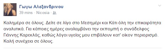 Δεν θα βρίσκεται στα καθήκοντά της για τις επόμενες μέρες η παρουσιάστρια του "Μεσημέρι και κάτι" του ΣΙΓΜΑ, Γωγώ Αλεξανδρινού καθώς όπως η ίδια ενημέρωσε τους διαδικτυακούς της φίλους προβλήματα υγείας την αναγκάζουν να μείνει στο σπίτι για μερικές μέρες με το Γιάννη Καρεκλά να αναλαμβάνει την παρουσιάση της μεσημμβρινής εκπομπής του ΣΙΓΜΑ. "Καλημέρα σε όλους. Δείτε σε λίγο στο Μεσημέρι και Κάτι όλη την επικαιρότητα αναλυτικά. Για κάποιες ημέρες αναλαμβάνει την εκπομπή ο συνάδελφος Γιάννης Καρεκλάς, καθώς λόγοι υγείας μου επιβάλουν κατ' οίκον περιορισμό. Καλή συνέχεια σε όλους" είναι το post της παρουσιάστριας. Να της ευχηθούμε περαστικά και σύντομα πίσω στα καθήκοντά της.