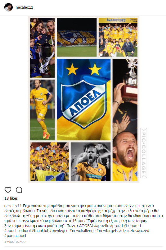 Ο ίδιος ανακοίνωσε με αυτόν τον τρόπο, την ανανέωση της συνεργασίας του με τον ΑΠΟΕΛ για δύο ακόμη χρόνια, γεγονός που τον συγκίνησε. Δείτε πιο κάτω την ανάρτησή του:
