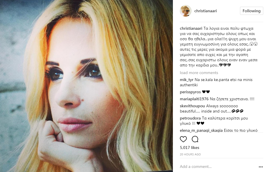 Η Χριστιάνα, αναρτώντας μία φωτογραφία, όπου απεικονίζεται η ίδια, θέλησε να ευχαριστήσει τον κόσμο για τις ευχές του, γράφοντας στη λεζάντα που τη συνόδευσε: “Τα λόγια είναι πολύ φτωχά για να σας ευχαριστήσω όλους όπως και όσο θα ήθελα...για όλα!!! Η ψυχή μου είναι γεμάτη ευγνωμοσύνη για όλους εσάς. Αυτές τις μέρες για ακόμα μια φορά με γεμίσατε από ευχές και με την αγάπη σας.. σας ευχαριστώ όλους έναν έναν μέσα από την καρδιά μου..”