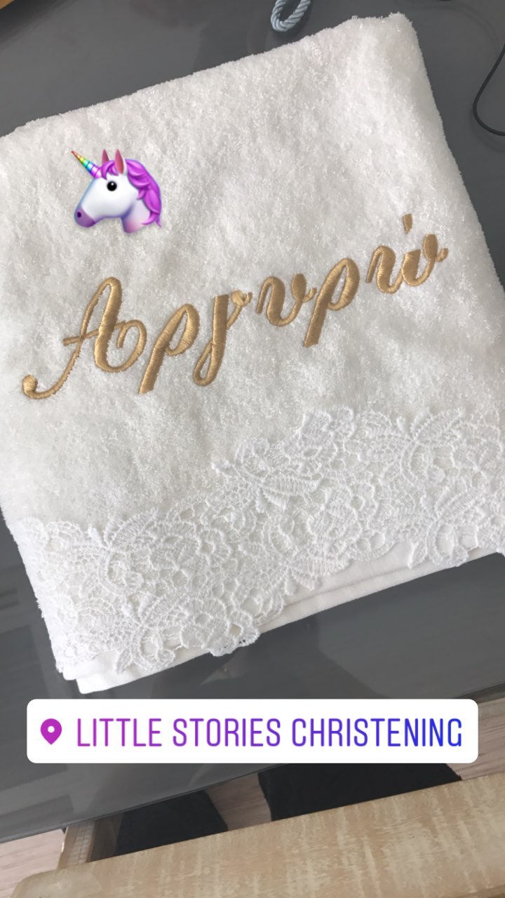 Η ραδιοφωνική παραγωγός του Super FM, ανήρτησε στον προσωπικό της λογαριασμό στο instagram μία φωτογραφία, με τη λευκή πετσέτα της βάπτισης με κεντημένο το όνομα της μικρής Αργυρώς.