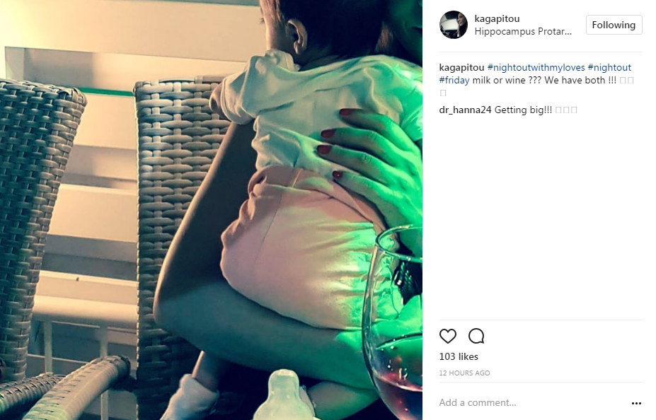 Η ίδια, ανήρτησε το βράδυ της Παρασκευής, 23 Ιουνίου, μία φωτογραφία στον προσωπικό τη λογαριασμό στο instagram, όπου εκείνη απολαμβάνει το κρασί της ενώ η μπέμπα το γάλα της.