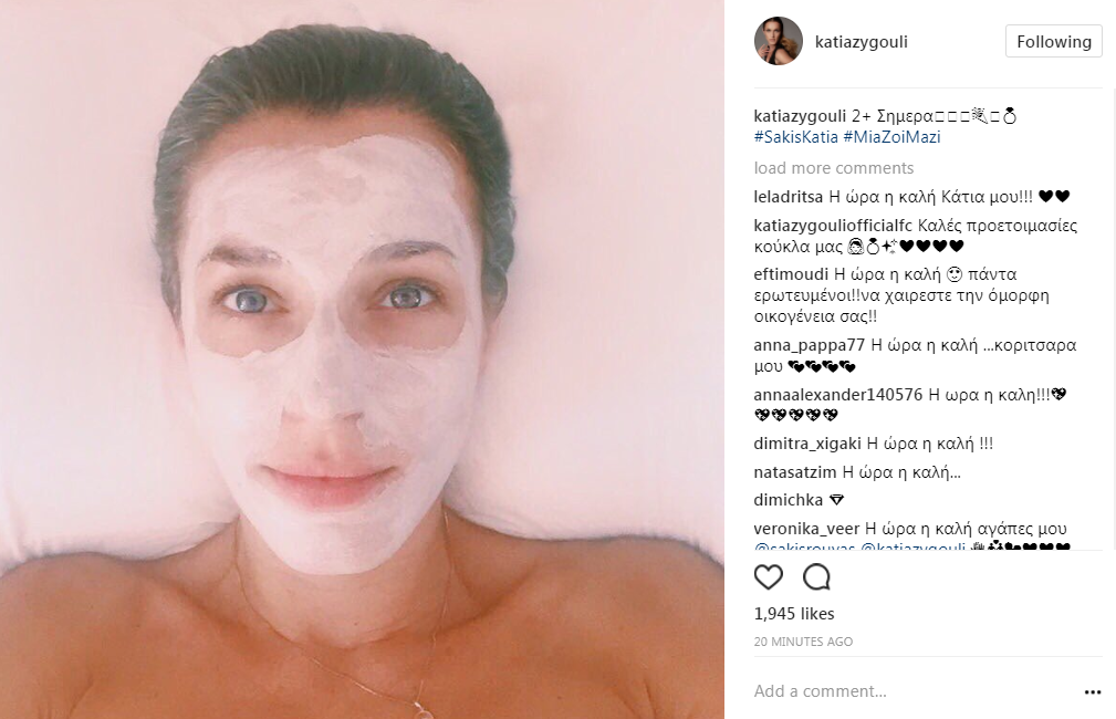 Η Κάτια ανήρτησε στον προσωπικό της λογαριασμό στο instagram, μία φωτογραφία, όπου απεικονίζεται η ίδια με μία μάσκα στο πρόσωπο, καθώς χαλαρώνει και απολαμβάνει θεραπείες για να λάμπει περισσότερο στη σημαντική αυτή στιγμή για τους δυο τους.