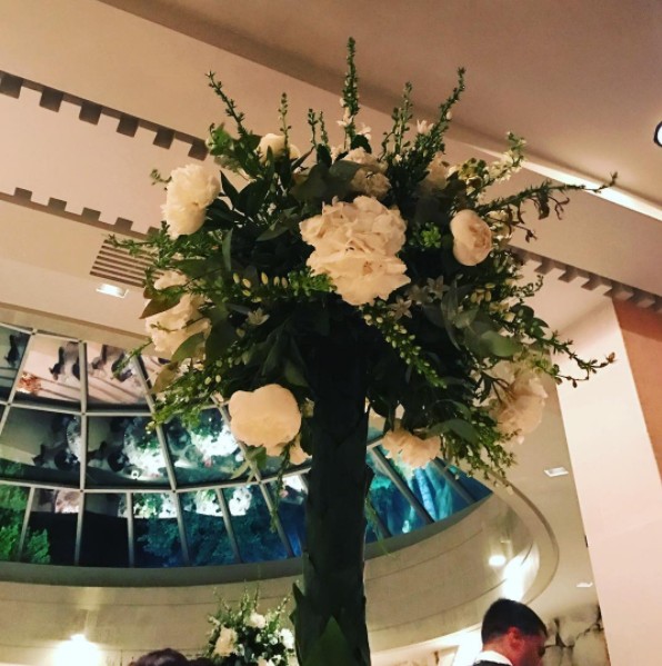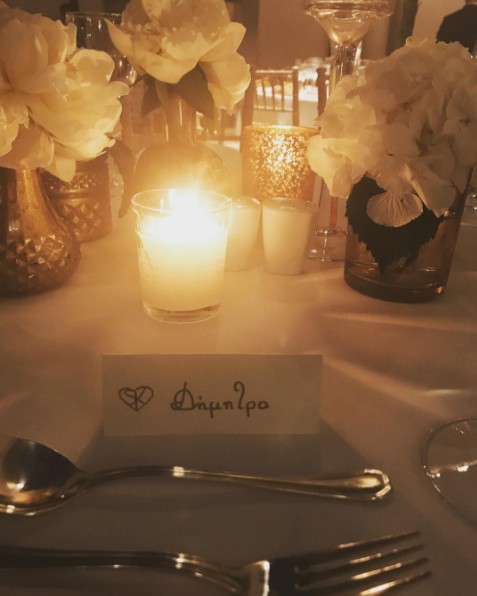 Το λευκό ήταν το χρώμα που κυριαρχούσε στην διακόσμηση όπως και το χρυσό, αποχρώσεις που είδαμε τόσο στα λουλούδια όσο και στην μπομπονιέρα με το σύμβολο S και K μέσα σε μια καρδιά.