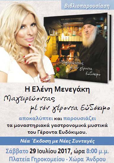 Η Ελένη Μενεγάκη, η οποία αυτό το διάστημα κάνει διακοπές στην Άνδρο μαζί με την οικογένειά της, πρόκειται να παρευρεθεί το Σάββατο, 29 Ιουλίου, στη Χώρα του νησιού, όπου θα παρουσιάσει το νέο βιβλίο συνταγών του πνευματικού της, Γέροντα Ευδόκιμου.