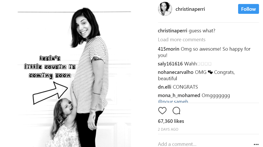 Ο λόγος για την τραγουδίστρια, Christina Perri, η οποία ανακοίνωσε το ευτυχές γεγονός μέσα από τον προσωπικό της λογαριασμό στο instagram, όπου ποζάρει με φουσκωμένη κοιλίτσα, την οποία χαϊδεύει η 3χρονη ανιψιά της, Tesla.