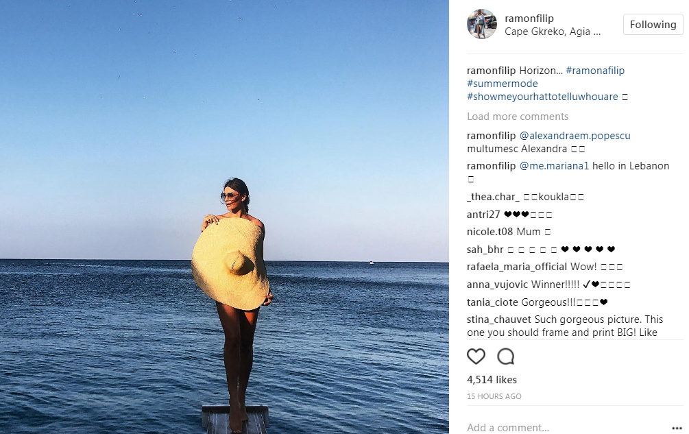 Η ίδια, αυτή την περίοδο, απολαμβάνει τις τελευταίες ημέρες του καλοκαιριού, στην Κύπρο και συγκεκριμένα στον Πρωταρά. Η Ramona Filip, η οποία είναι αρκετά ενεργή χρήστη του instagram, ανήρτησε την πιο σέξι πόζα που την έχουμε δει ποτέ, ποζάροντας μόνο με ένα oversized, ψάθινο καπέλο.