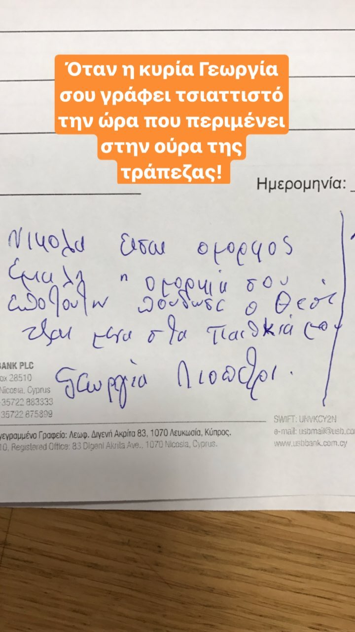 Ο Νικόλας Ιωαννίδης είναι πολύ αγαπητός στο κοινό και κυρίως στο γυναικείο. Ο πανελίστας της εκπομπής "Όλα για σένα" σήμερα το πρωί πήγε στην τράπεζα και ενώ περίμενε στην ουρά, η κυρία Γεωργία από το Λιοπέτρι του έγραψε ένα τσιαττιστό.