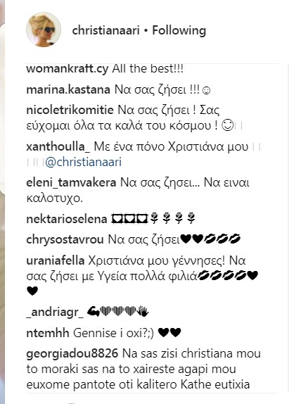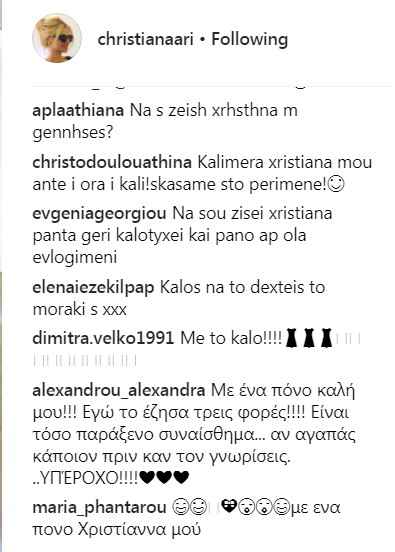 Μία φωτογραφία που έδειχνε την Χριστιάνα Αριστοτέλους να κρατάει τα λευκά και ροζ σεντονάκια της κορούλας της ήταν αρκετή για να δεχτεί η παρουσιάστρια καταιγισμό ευχών για την κορούλα της. Συγκεκριμένα η ίδια, η οποία παραμένει στο σπίτι εδώ και μία εβδομάδα, περιμένοντας τον ερχομό της κορούλας της έγραψε στη λεζάντα: "Γλυκοπαιδευομαστε με τα πλυντηρια..Καλο βραδακι σε ολους μας, γλυκο,ομορφο,ηρεμο..". Αμέσως οι διαδικτυακοί της φίλοι έσπευσαν να της ευχηθούν για την κορούλα της, που σύμφωνα με πληροφορίες θα πάρει το όνομα Μελίνα.