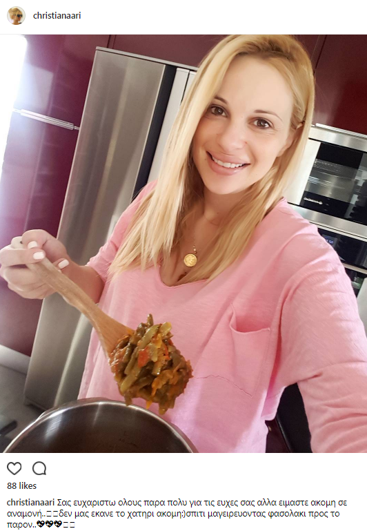 “Σας ευχαριστώ όλους πάρα πολύ για τις ευχές σας αλλά είμαστε ακόμη σε αναμονή… Δεν μας έκανε το χατίρι ακόμη! Σπίτι μαγειρεύοντας φασολάκι προς το παρόν…”, έγραψε χαρακτηριστικά στη λεζάντα που συνόδευσε την εικόνα.