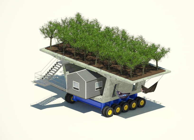 Για ένα κόσμο πιο πράσινο, ο Βενεζουελανός Marcelo Ertorteguy, του studio Stereotank, φαντάζεται σπίτια που τα ονομάζει "green machines", και τα οποία συνδυάζουν χώρο κατοικίας, καλλιέργειας και έναν τολμηρό τρόπο μετακίνησής τους. Όπως το δείγμα της φωτό, που το σπίτι και το χωράφι κάθονται πάνω σε τροχούς! Στους άλλους σχεδιασμούς που προτείνει, προέκυψε και μια πισίνα που διαθέτει δέντρα που μεγαλώνουν μέσα στο νερό της!