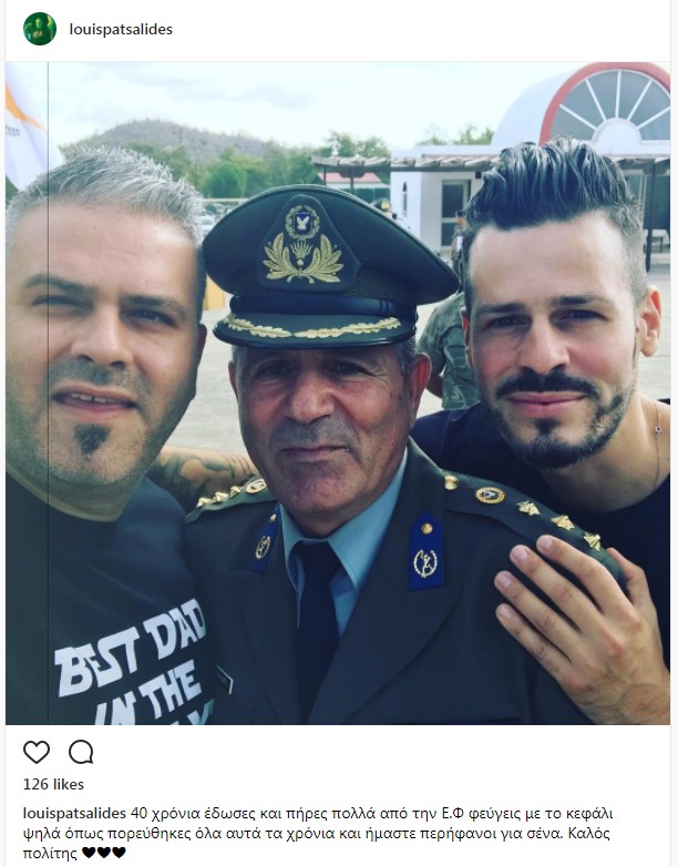 Μία συγκινητική ανάρτηση έκανε στον προσωπικό του λογαριασμό ο Λούης Πατσαλίδης και αφορούσε στον πατέρα του ο οποίος αφυπηρέτησε από την Εθνική Φρουρά μετά από 40 χρόνια υπηρεσίας. Στη φωτογραφία ποζάρει ο ίδιος μαζί με τον αδερφό του Αντρέα και τον πατέρα του Γιάννο, ο οποίος φορά την στρατιωτική στολή, ενώ στη λεζάντα έγραψε: "40 χρόνια έδωσες και πήρες πολλά από την Ε.Φ φεύγεις με το κεφάλι ψηλά όπως πορεύθηκες όλα αυτά τα χρόνια και ήμαστε περήφανοι για σένα. Καλός πολίτης".