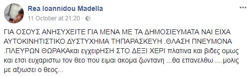 “Για όσους ανησυχείτε για μένα με τα δημοσιεύματα, ναι είχα αυτοκινητιστικό ατύχημα την Παρασκευή. Θλάση πνεύμονα, πλευρών, θώρακα και εγχείρηση στο δεξί χέρι, πλατίνα και βίδες, όμως και έτσι ευχαριστώ το Θεό που είμαι ακόμα ζωντανή… θα επανέλθω… μόλις με αξιώσει ο Θεός”.