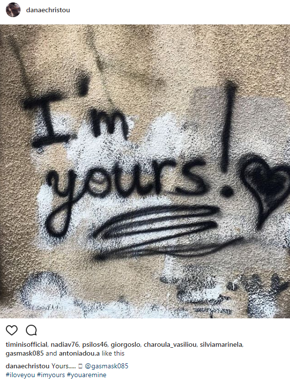 Η ίδια ανήρτησε στον προσωπικό της λογαριασμό στο instagram, μία εικόνα (βλ. πιο κάτω), στην οποία αναγράφεται: “Είμαι δική σου”, κάνοντας tag τον σύντροφό της. Στα hashtags που χρησιμοποίησε, έγραψε: “#σε αγαπώ #είσαι δικός μου #είμαι δική σου”, με τον έρωτα της να ξεχειλίζει για εκείνον.