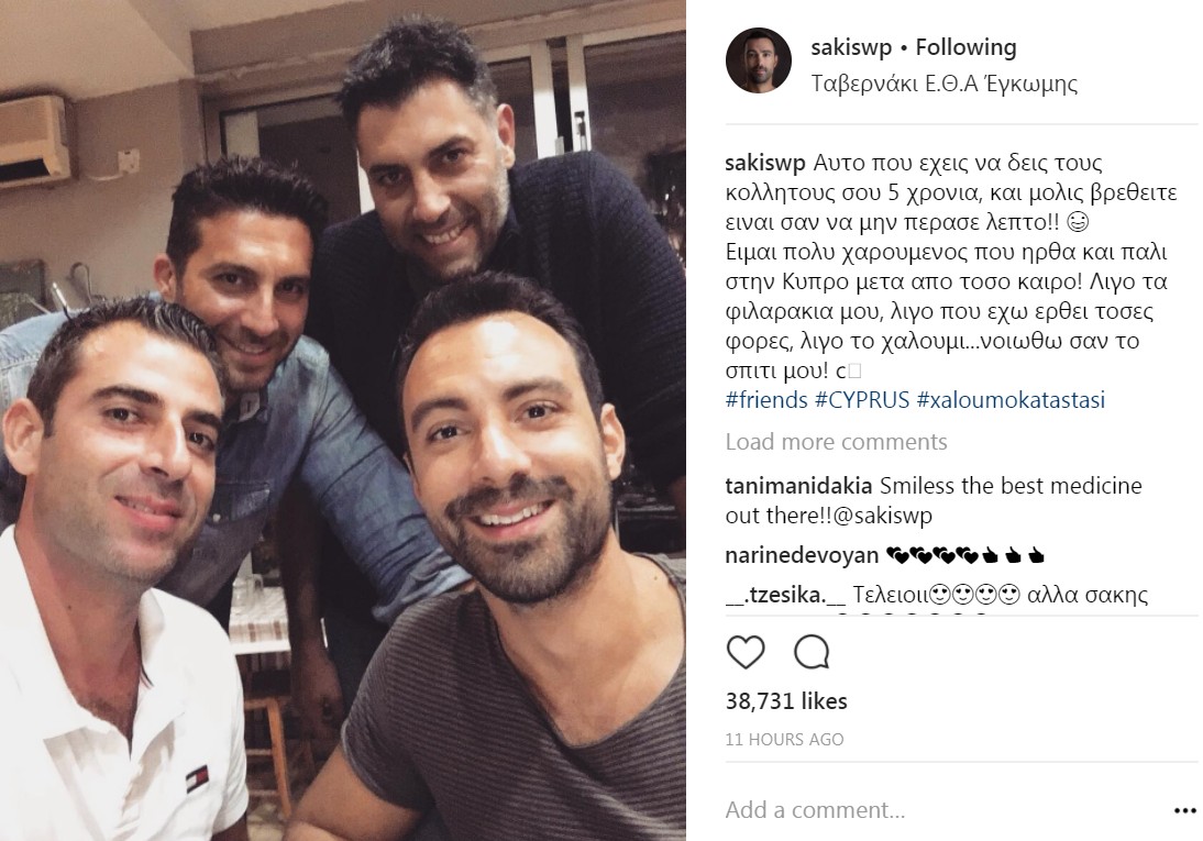 Όπως σας ενημερώσαμε ο Σάκης Τανιμανίδης από χθες βρίσκεται στην Κύπρο. Ο ίδιος μας ενημερώσε για το γεγονός μέσα από τον προσωπικό του λογαριασμό στο instagram χωρίς να μας λέει το λόγο. Αργότερα το βράδυ ο ίδιος ανέβασε μία φωτογραφία από μία συνάντηση που είχε γράφοντας στη λεζάντα "Αυτο που εχεις να δεις τους κολλητους σου πέντε χρονια, και μολις βρεθειτε ειναι σαν να μην περασε λεπτο! Ειμαι πολυ χαρουμενος που ηρθα και παλι στην Κυπρο μετα απο τοσο καιρο! Λιγο τα φιλαρακια μου, λιγο που εχω ερθει τοσες φορες, λιγο το χαλουμι...νοιωθω σαν το σπιτι μου!". Όπως μπορείτε και εσείς να δείτε από τη φωτογραφία ανάμεσα στους φίλους του είναι και ο Κυριάκος Πελεκάνος. Πιθανότατα οι δυο τους να γνωρίστηκαν την εποχή που ο Κυριάκος Πελεκάνος σπόυδαζε στη Θεσσαλονίκη.