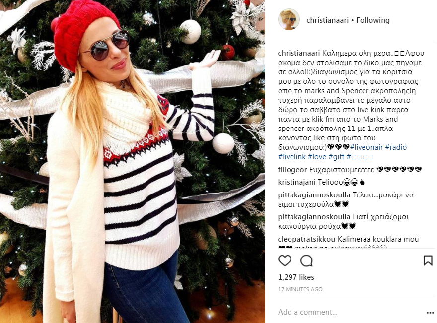Η παρουσιάστρια, το πρωί της Τρίτης, 28 Νοεμβρίου ανήρτησε μία φωτογραφία στον προσωπικό της λογαριασμό στο instagram, όπου ποζάρει χαμογελαστή, μπροστά στο χριστουγεννιάτικο δέντρο γνωστού πολυκαταστήματος, στη Λευκωσία.