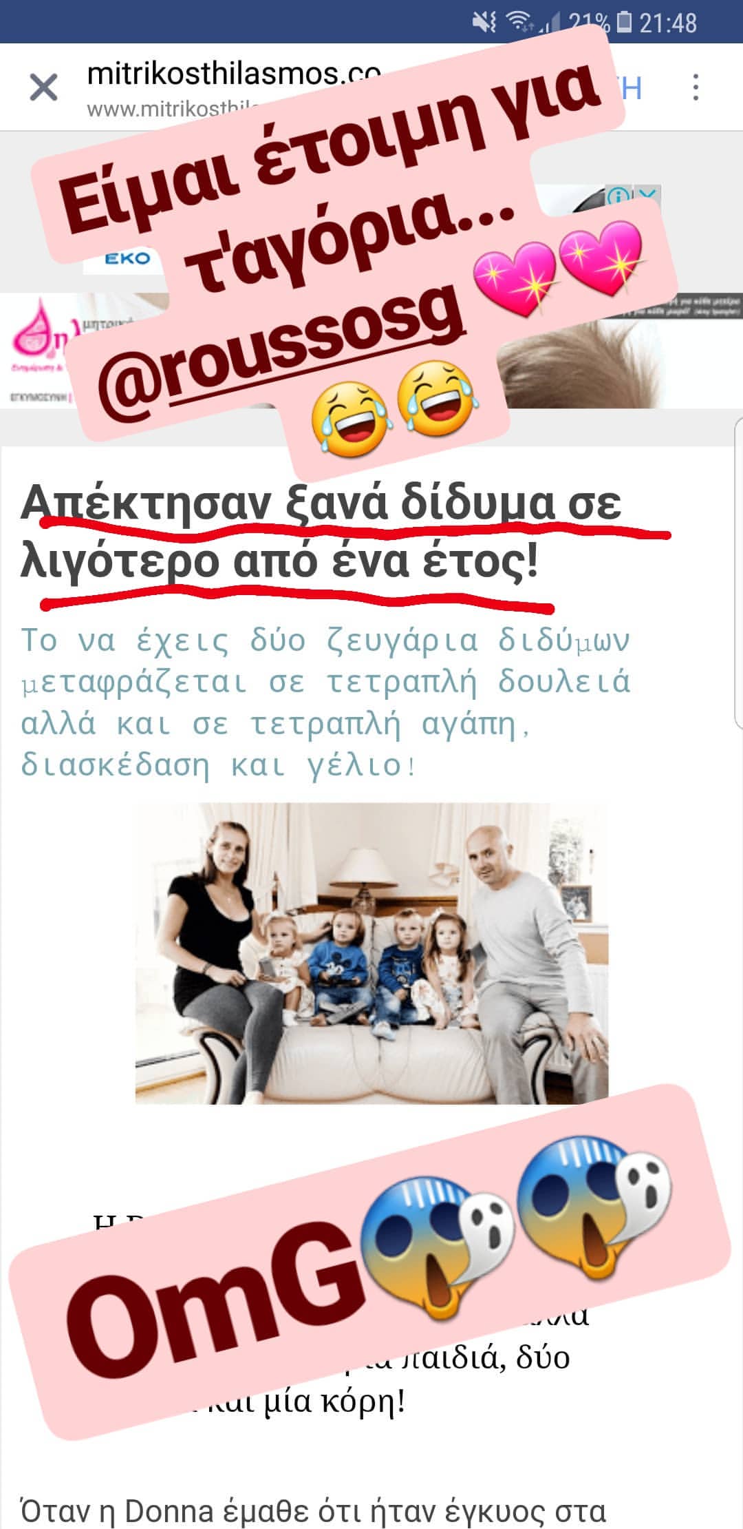 Με αφορμή ένα άρθρο που αναδημοσίευσε η σύζυγος του παρουσιαστή, μέσα από τον προσωπικό της λογαριασμό στο instagram, έγραψε επισημαίνοντας τον σύζυγό της: “Είμαι έτοιμη για τα αγόρια”, υπονοώντας πως θα ήθελε να μεγαλώσουν την οικογένειά τους.