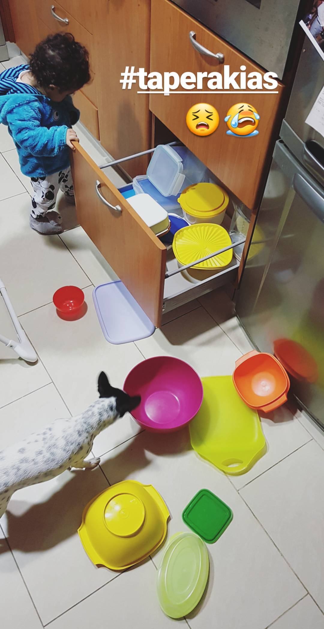 Χθες ο ηθοποιός έκανε το λάθος να τον αφήσει για λίγο μόνο στην κουζίνα με αποτέλεσμα όταν επέστρεψε βρήκε όλα τα ταπεράκια έξω στο πάτωμα και δεν έχασε την ευκαιρία να τον φωτογραφήσει και να αναρτήσει την εικόνα στο instastories του.