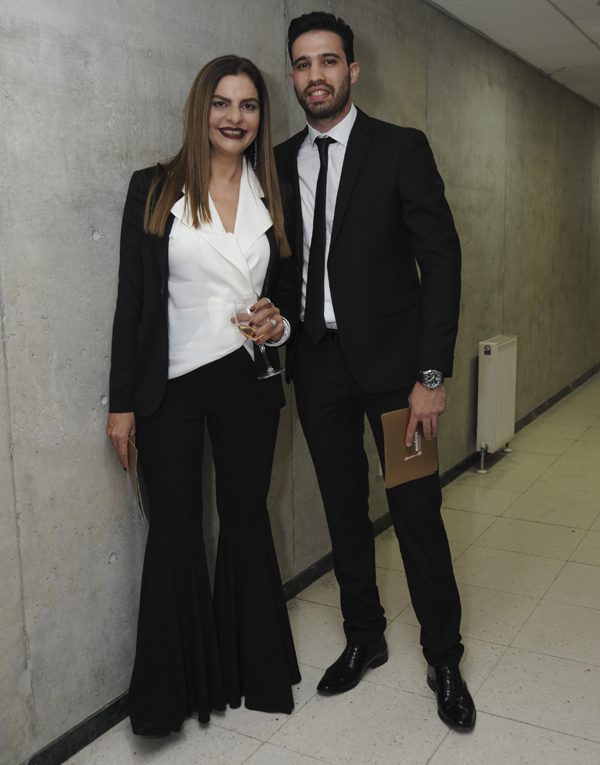 Η Αθηνά Νικολαϊδου, Εμπορική Διευθύντρια Καλλυντικών Ομίλου Folli Follie Κύπρου μαζί με τον Γιώργο Αγγελόπουλο στα παρασκήνια λίγο πριν αποτείνουν το βραβείο "Fashion Design της Χρονιάς"